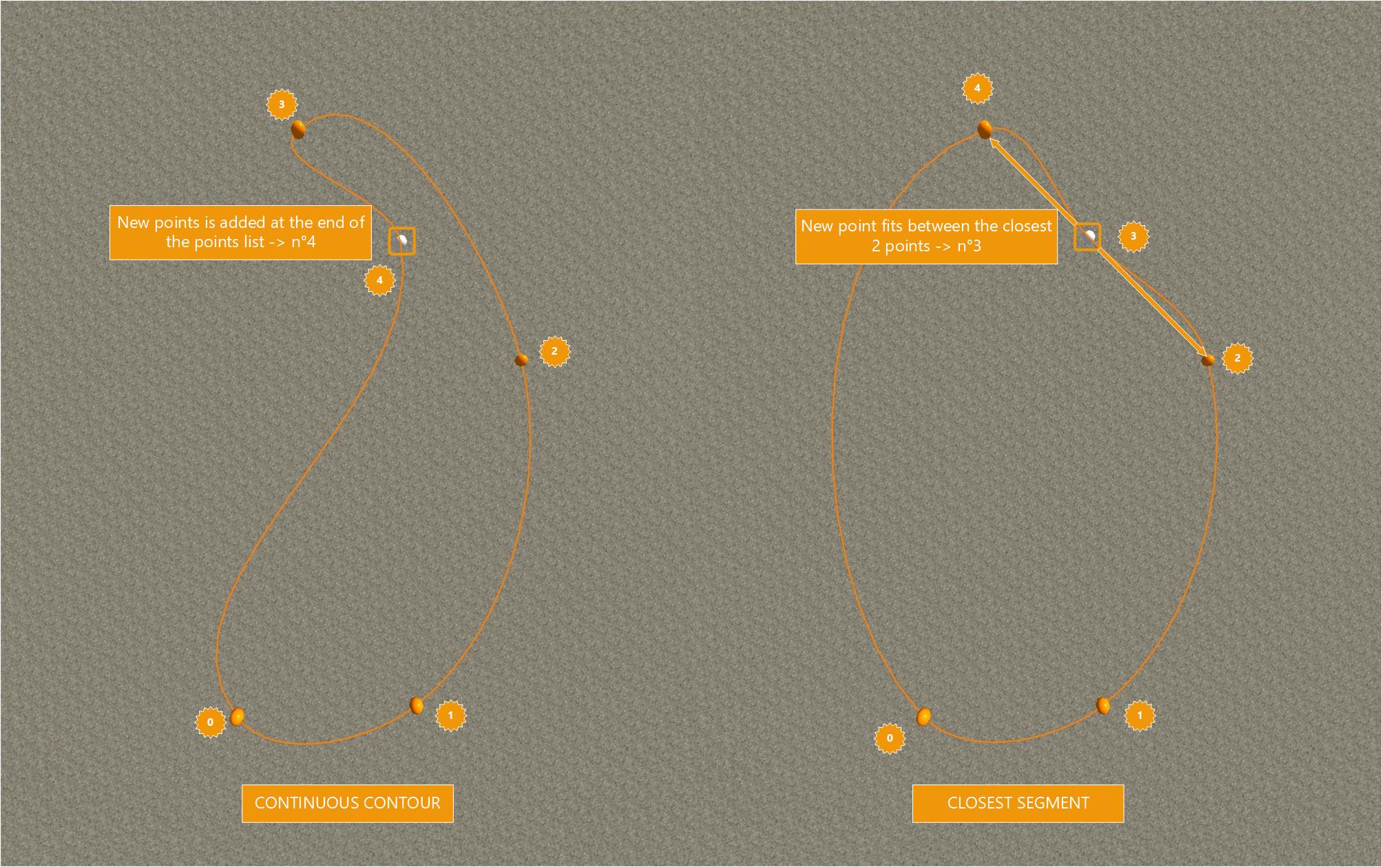 - Closest segment: the new curve point is inserted in the points list between the two closest existing points. This is the best mode to refine an existing curve contour.