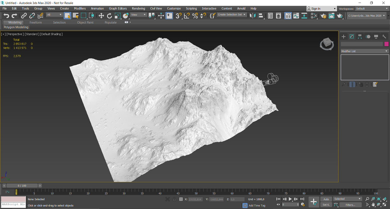In the scene we have a terrain and an export area as defined earlier in this chapter. After exporting the landscape, we get it in a modelling software. In this example, we have used Autodesk 3dsMax(c):