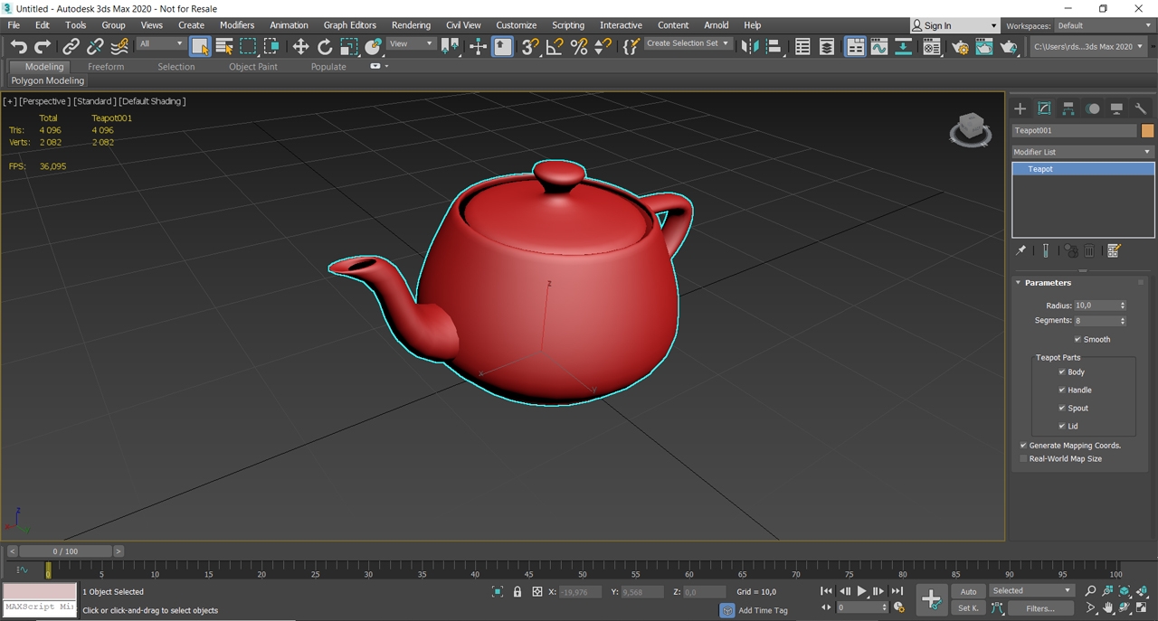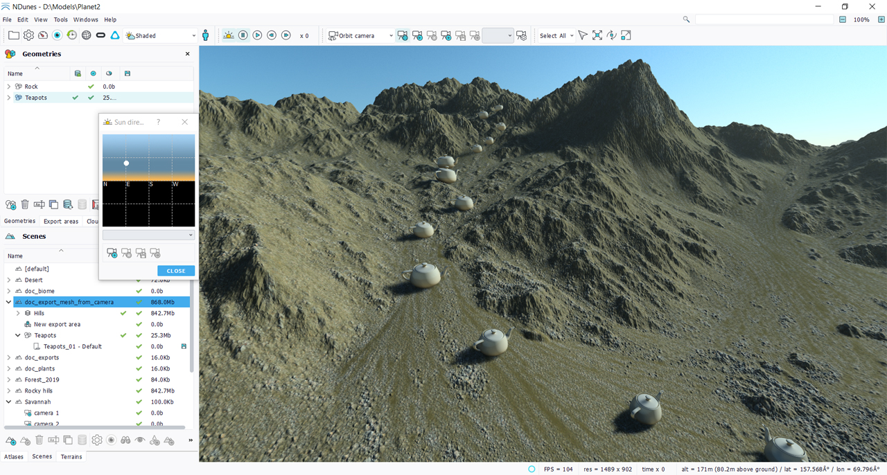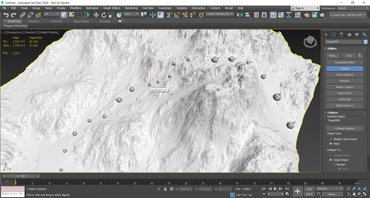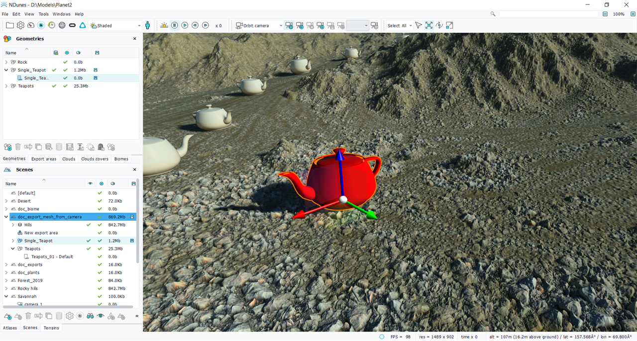 Now in the modelling software, let's do some modelling. As you might notice, well, I'm not good at that. So I'll create teapots. And what would a 3d software documentation look like without a bunch of teapots in it? So let's go for a trail of teapots. They're created on the exported landscape: