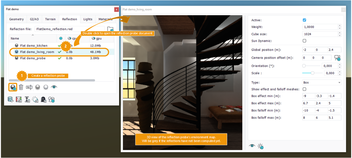 The geometry may contain reflective parts / materials. The default reflection is the sky, like with the landscape. For indoor scene, this may not be suitable. NDunes allows to define custom reflections by using reflection probes. They are objects added to the geometry and defining a bounding volume where environment maps can be computed.