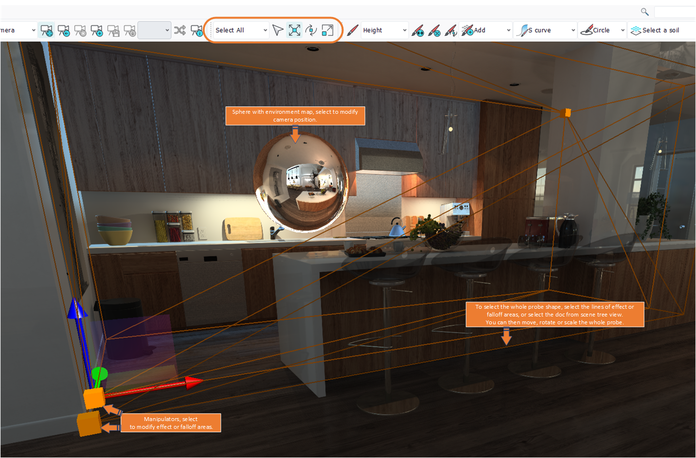 - a camera position offset: defining the point of view when capturing the spherical view of the probe's surroundings.