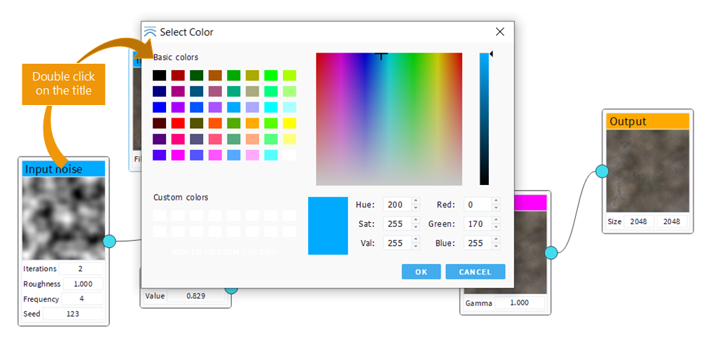 Nodes can also have parameters. They are visible and can be modified in the lower part of the node itself. These parameters can be colors, values, etc.