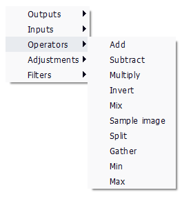 Several transformation nodes can be added via a contextual menu appearing on right click of the mouse. Nodes can be operators like add and mix or filters like a gaussian filter. A full list of all the nodes is available here: List of graph nodes.