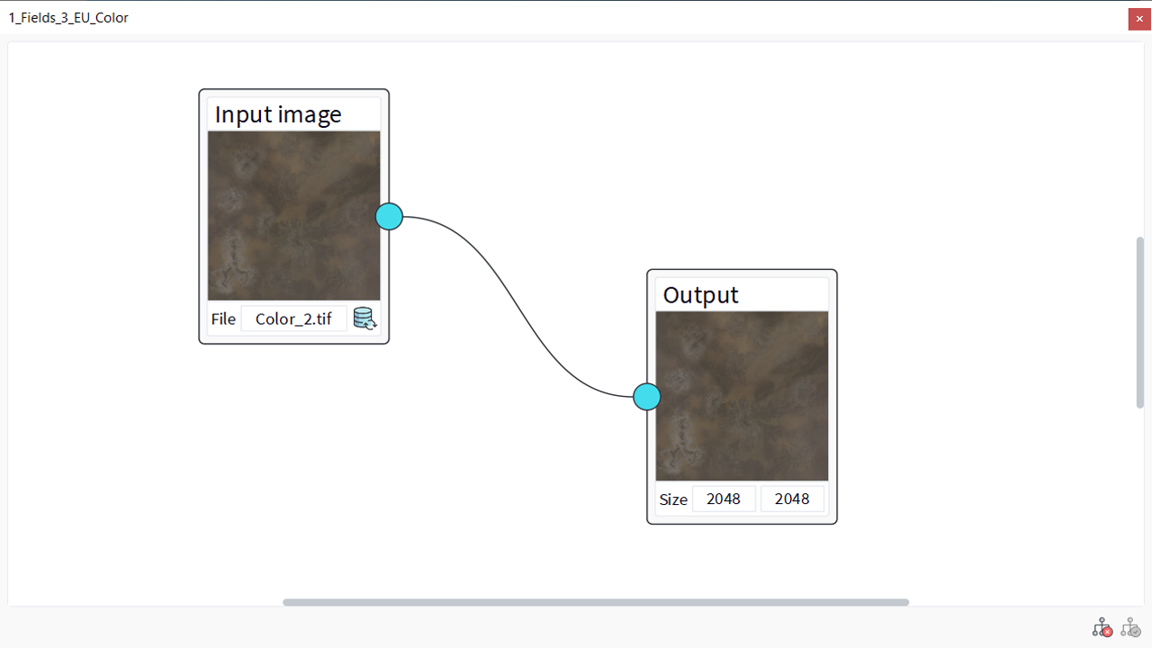 We can see an input node and an output node. The input node loads the image on disk. The output node finalizes the image after all the modifications. For now, there isn't any node between the input and the output, so no modification: the exit equals the enter.