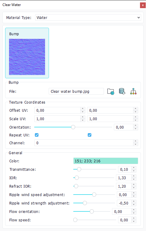 - IOR : Index of reflection, to set how reflective you want your water to be. Default value for water is 1.33.