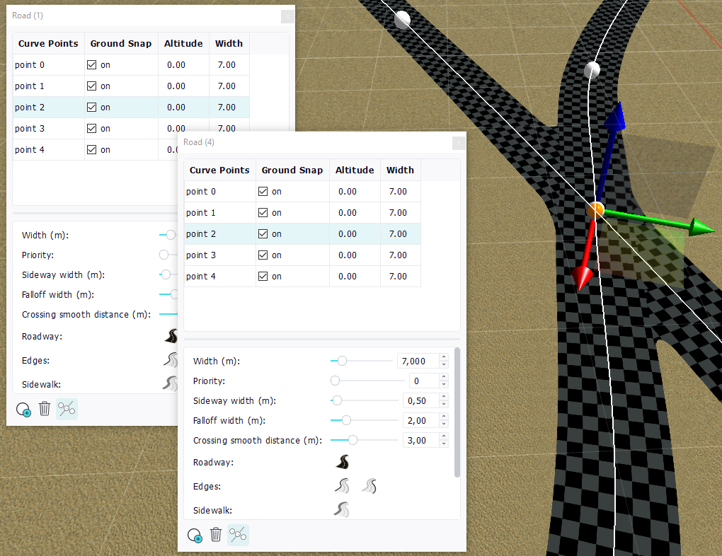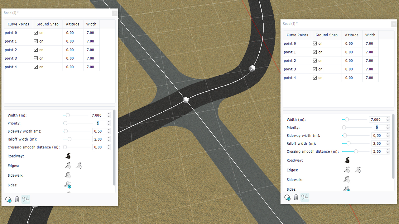 Each road has a priority. This parameter is mainly used to figure out the order used to paint the road materials and to determine the order of application of the road surface markings. The illustration below shows the road with the higher priority take the lead in the application of the material over the crossing: