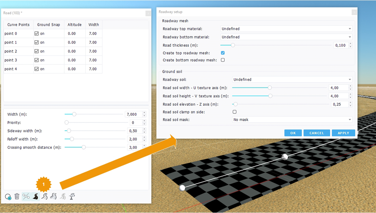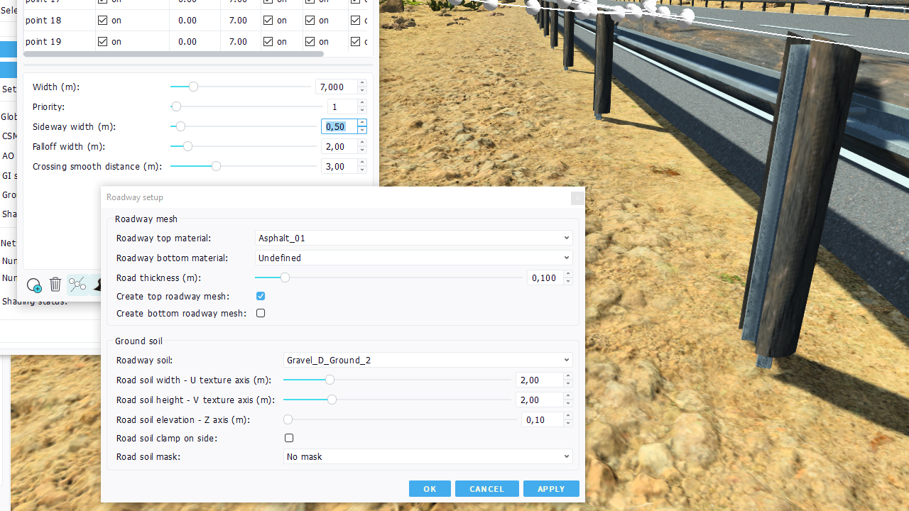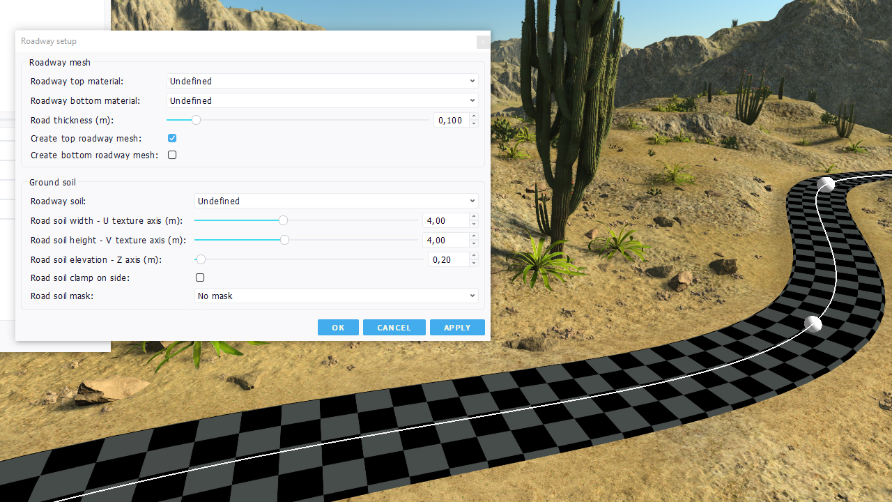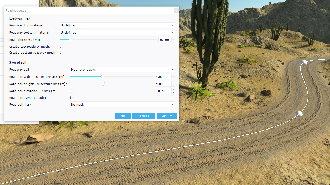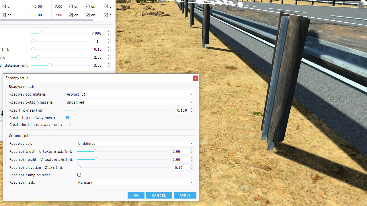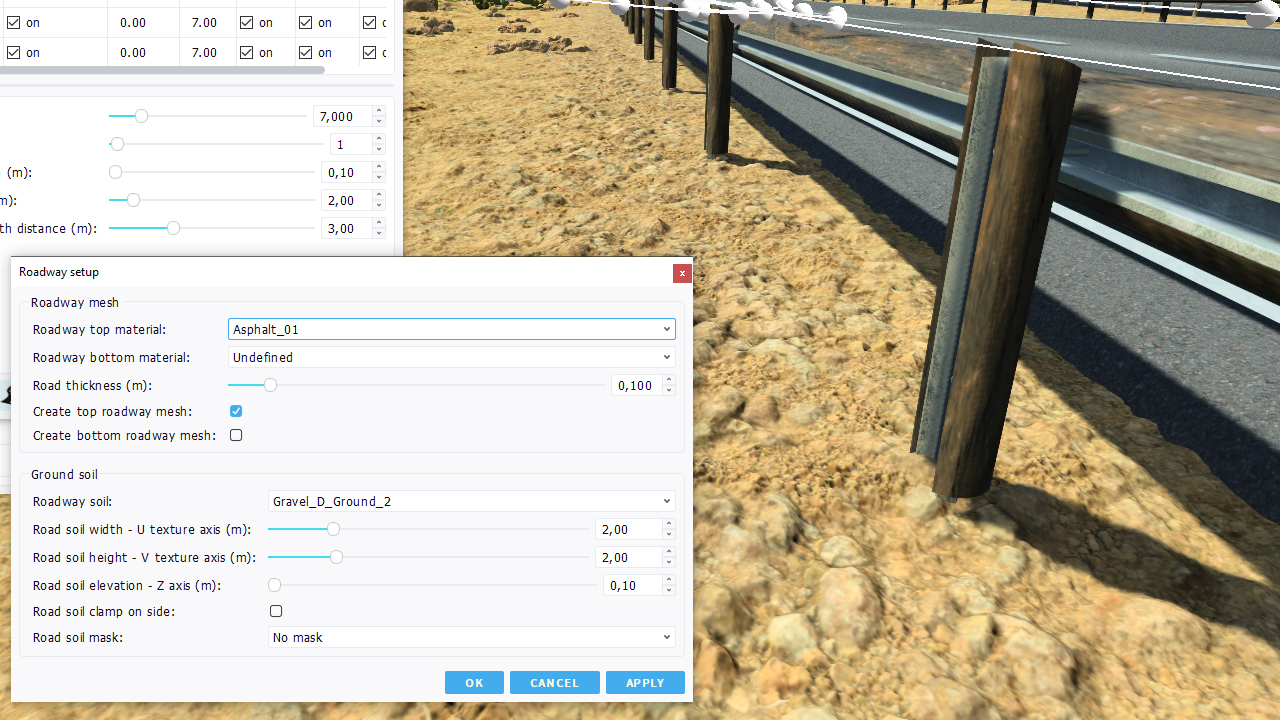 - Auxiliary soil parameters: choice in terms of soil to use aside the road or as a replacement for the soil mesh.