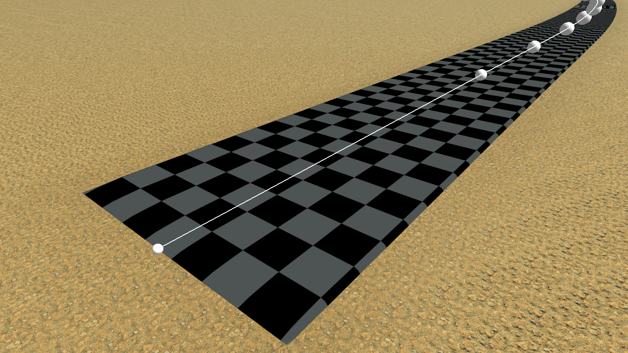 The roadway is the central part of the road. By default, the roadway shows a grey / black checkerboard when a road is created. The default roadway has a small 15 cm round cap to reach back the ground and road ends also fade to the ground on the last meter of the road.