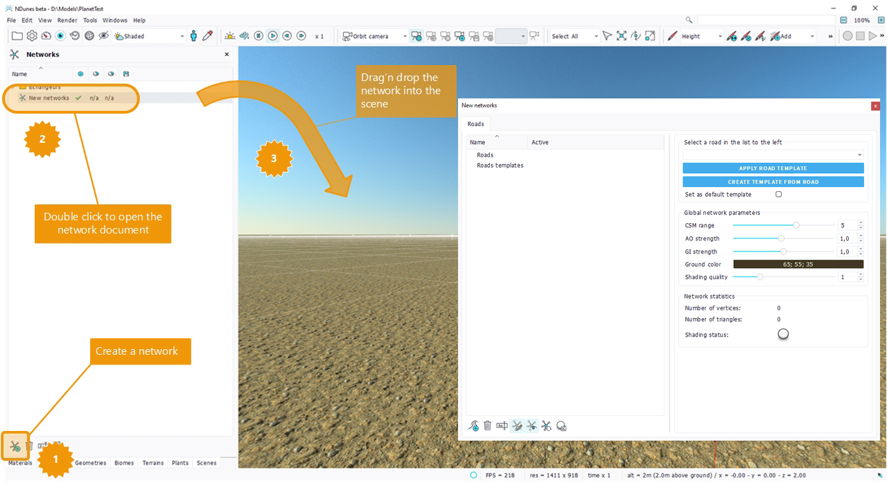 In the current version, network features only cover the creation of roads networks and is still at the "work in progress" development phase. We apologize in advance if you experience some issues with the system which is very new for now! In all cases don't hesitate to contact us directly (contact@ndunes.com) for any assistance.