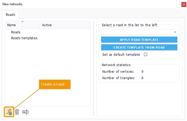 Each network element has its own tab in the network panel. Here we see roads. There's a road creation button down the panel along with other functions such as the road document destruction or the road renaming. Double click on a created road to open it.
