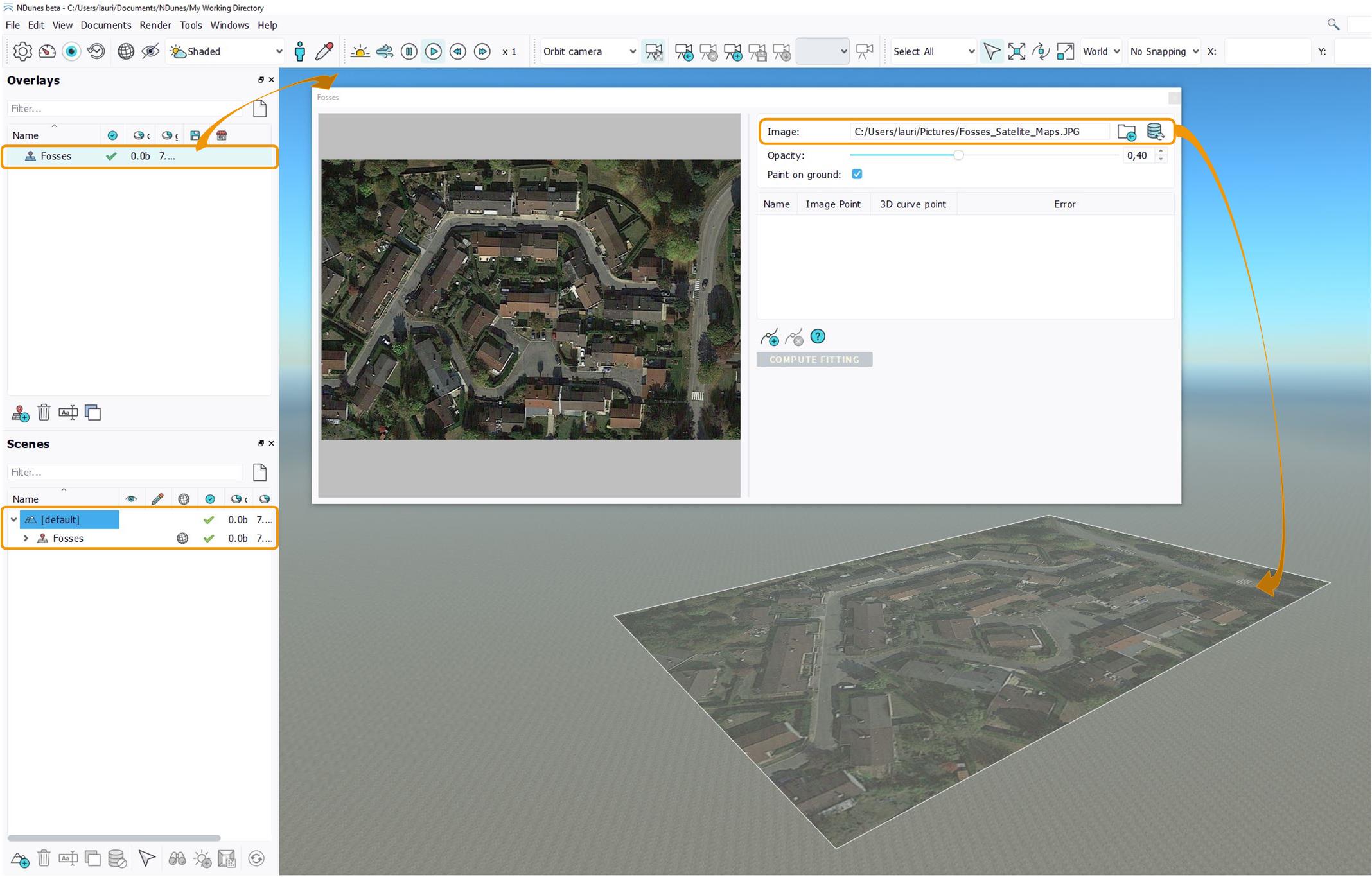 The overlay can be positionned in the scene like any other documents using the translation, rotation and scale gizmos. However, if your overlay is a form of map and you need to place it precesily to fit other geolocalised data in NDunes, using the gizmos can be difficult. This is why you can use our fitting algorithm.