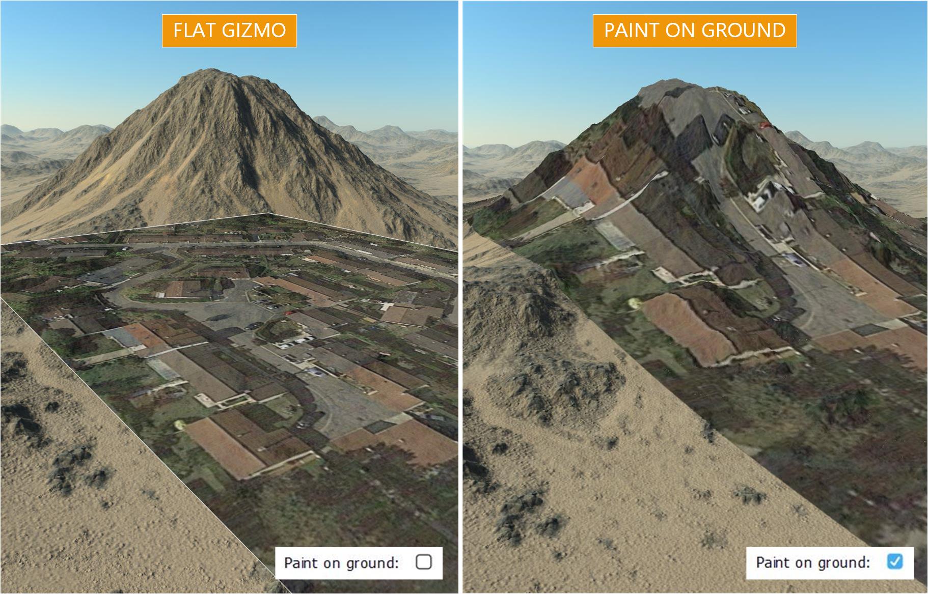 The paint on ground option will paint the overlay image on the 3D meshes (landscape, buildings...). If unchecked, the overlay will be displayed "flat" as a floating custom shape.