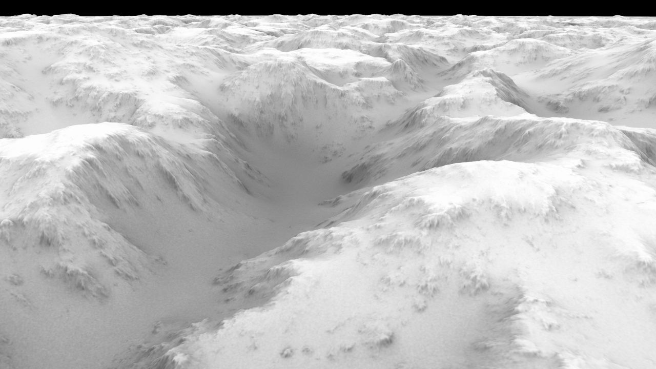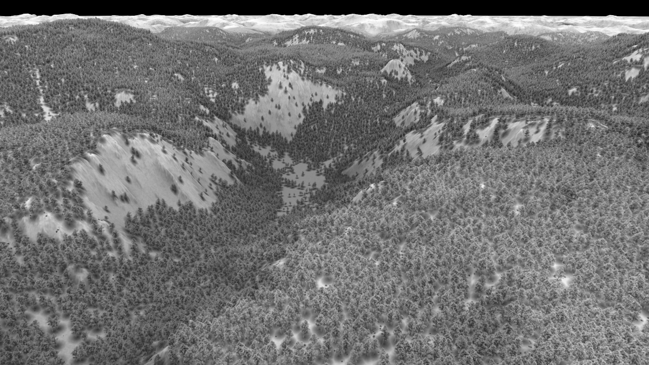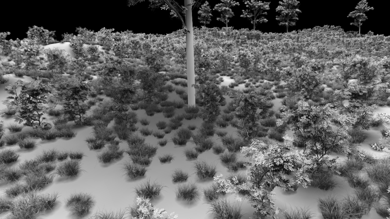 We can see that the AO of the landscape influences the AO of the trees that are planted onto it: trees in deep valleys are darker than trees on top of hills. This is due to the influence of the landscape AO over the vegetation layer that covers it. Note that we have the same mechanism with terrains: The atlas layer influences the The first level soil which itself influences Secondary soils. The resulting AO layer influences plants in biomes that are covering it. This mechanism's purpose is to maintain a global coherency in the lighting of the scene.