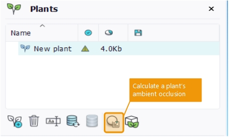 The ambient occlusion layer of a plant is calculated using the button in the toolbar of the plant document list. Several plants AO can be launched in one click by multiple-selecting plants in the list:
