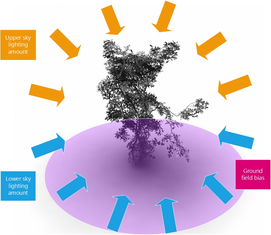 The upper sky lighting amount is the amount of upper light that is considered for the AO calculation (in orange). The same goes for the lower sky lighting amount (in blue). Finally the AO produced on the ground can be biased to appear darker or lighter depending on the average surroundings of that plant (more details below). These parameters are fairly important since NDunes's lighting model uses AO a lot to simulate interactions between a given mesh and its surrounding environment in real-time. Therefore, AO should be representative of the average neighborhood conditions into which this plant is meant to be used. More details on this just below: