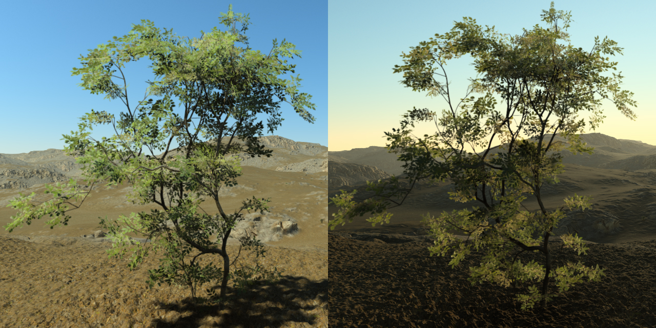 A prism's facet contain most of the parameters needed to do a proper shading of the plant. Even if geometrically it's a plane, it stores all lighting informations and it reacts to the lighting and it's rendered in 3D with depth. In the image below we have focused on a prism's facet and we see how it reacts to the variation of the sun direction: