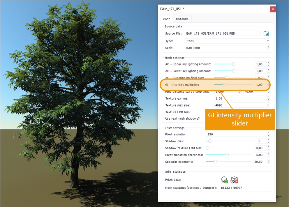 If we setup a simple biome using that plant, we can see how the GI multiplier setting will interact with the overall result we get: we can darken our image or make it look bright. The GI will tend to be stronger in dense leaves areas: