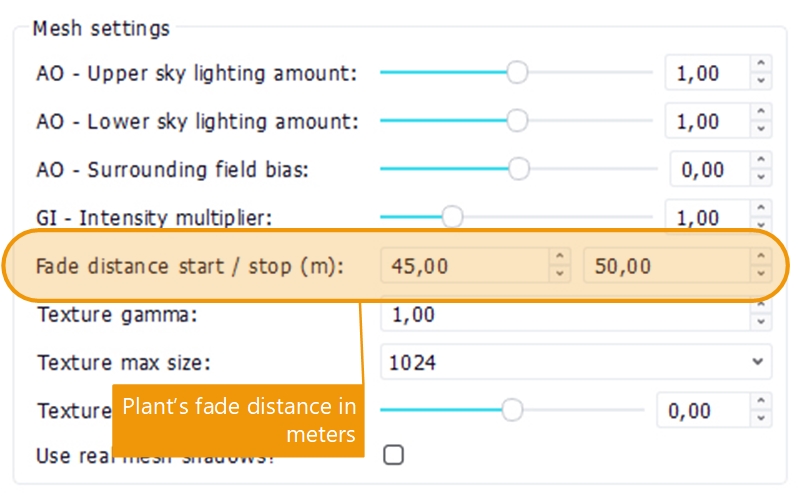 The parameter that rules the fading of the mesh is defined in the "Mesh settings" of the plant:
