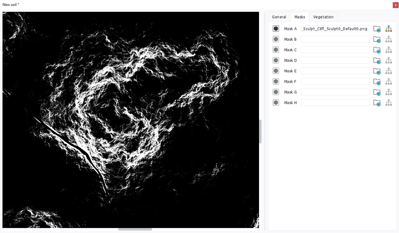 Masks can be either supplied or generated by modifying a base image using the Graph editor. A terrain can have up to 8 different masks. These masks images are found back in the terrain editor and can be dragged then to restrict the display area of a secondary soil: