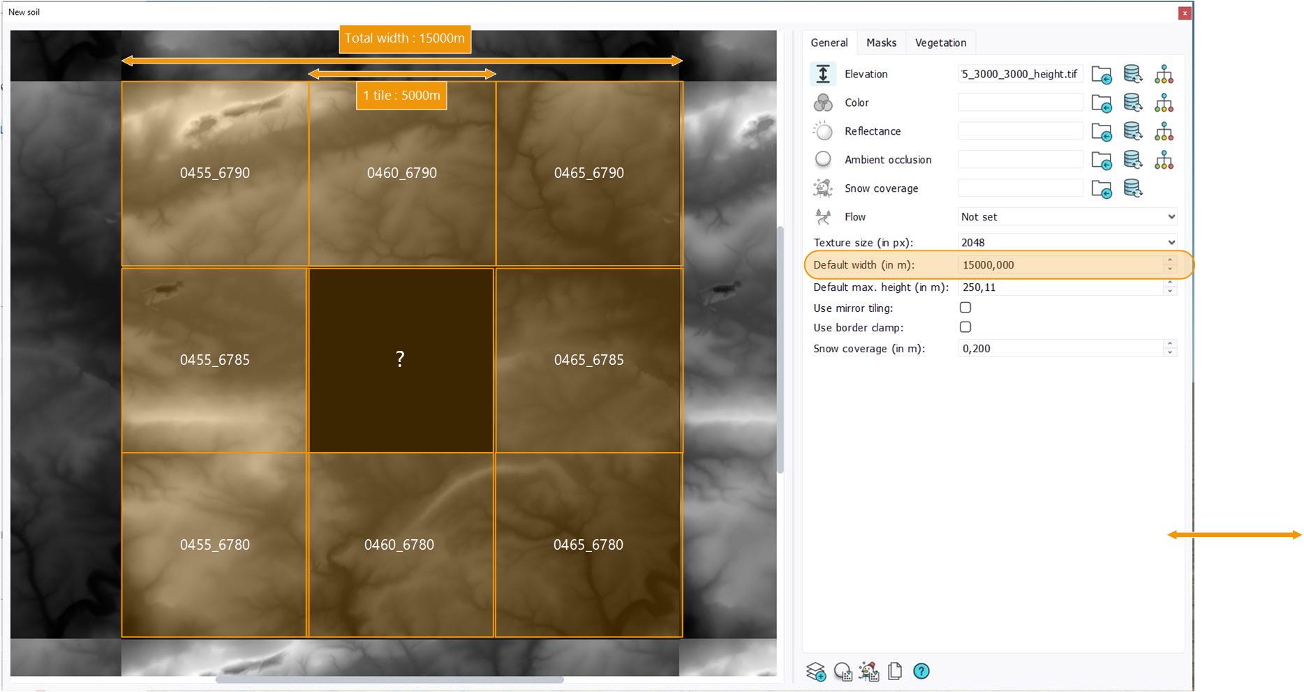 - The generated texture is always square, so to have a continuous elevation signal, you must select all the necessary tiles to form a square ( 1 tile, or 2x2, or 3x3... etc).