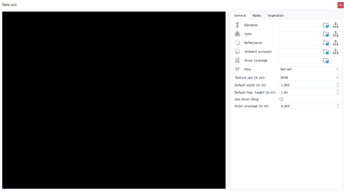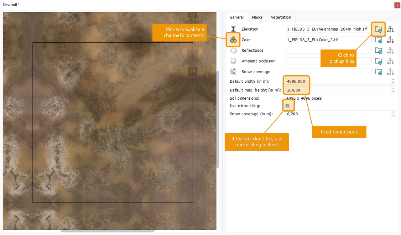 A soil just needs a height map in the elevation channel to work. This is the very minimal set of data it needs. Adding an elevation image will remove the invalid flag we saw above in the soil description. However, we will not go far with only that. So let's assume we need at least: