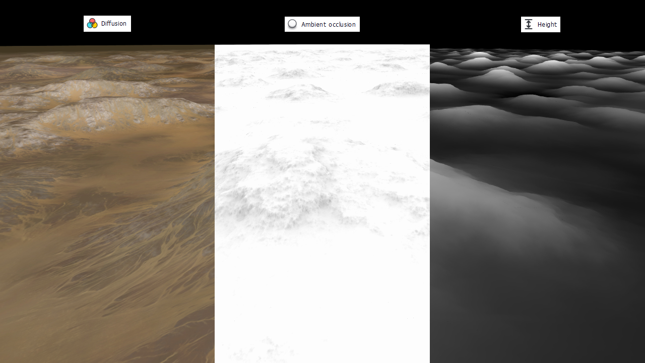 We can see the tiling in the display of the terrain here. This is normal for isolated terrain edition. Now, we can look at each channel contribution if we select the corresponding display mode from the top toolbar: