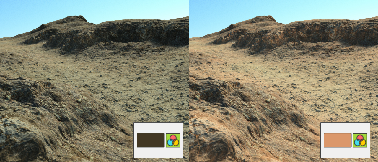 In the images above, the atlas color has been modified and it overally influences the soil layers above it. This is due to the usage of the 'overlay' color blending mode. Some soils allow more or less influence of the underlying layers colors. This is defined in the soil blending parameters of the terrain. Of course, each terrain will decide how a given soil is to be blended and the amount of influence it'll carry from underlying layers.