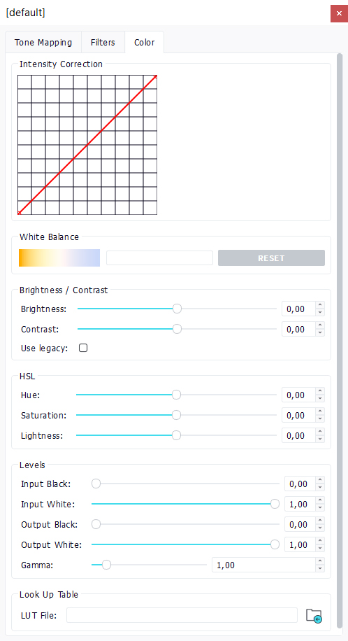 - The "Color" tab: This tab contains all color correction tools: color curve, gamma, white balance, LUT, etc...