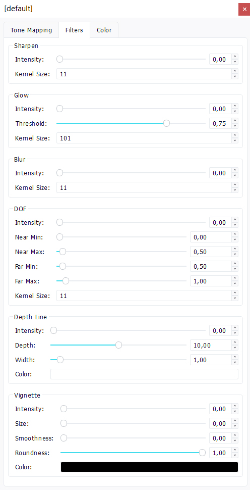- The "Filters" tab: A number of post processing effects can be found there, such as glow, sharpen, depth-of-field, etc...