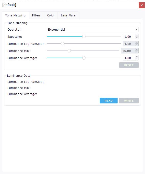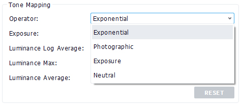 - Exponential: This tonemapping mode is the default. It uses the "Exposure" and "Luminance average" parameters. It produces images with quite a strong contrast and is easy to modify, as just changing the value of the "Luminance average" will change the overall look of the resulting image.