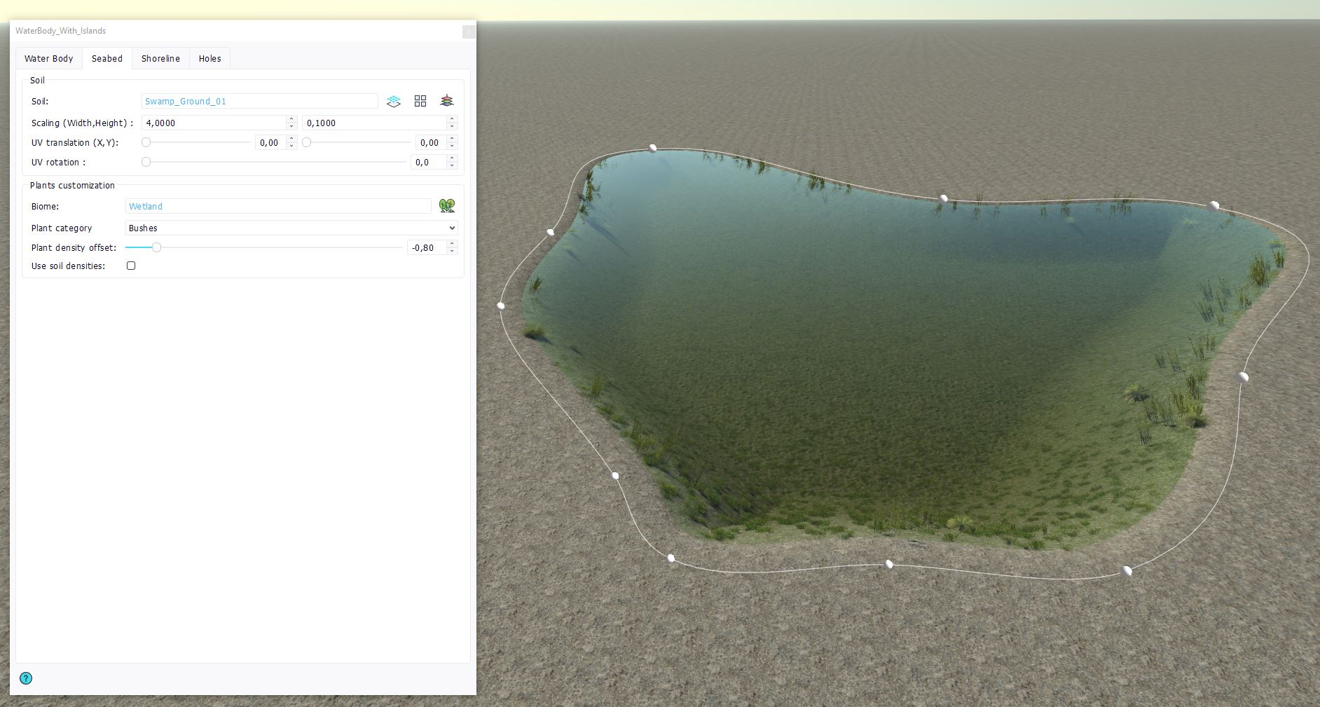 You can add a specific soil to your seabed, by selecting a soil document in the "Soil" selector. You can also drag & drop a soil document inside the waterbody in the viewport. As in Decals, you can specify the scaling and UV mapping of the soil, as well as wang tiling and triplanar mapping.