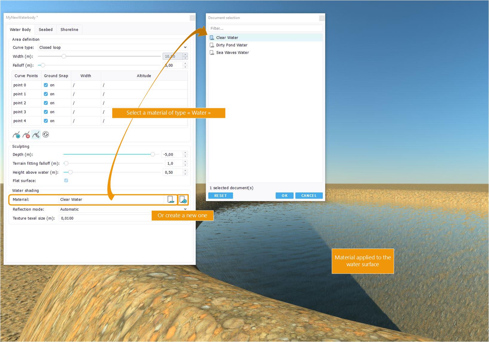 When creating a waterbody, a default water rendering effect is applied to the water surface, making it a smooth, transparent, reflective surface. However, if you want to customize the rendering of your water and add more effects, you can do so by applying a water material.