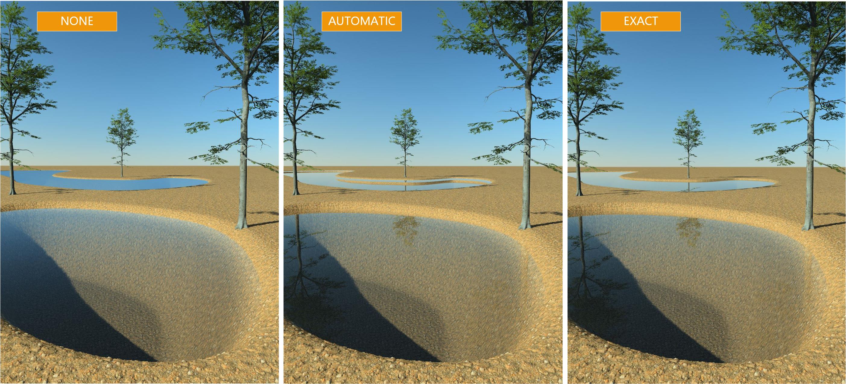 - The "Reflection mode : Exact" parameter : there will be a specific reflection pipeline for this particular waterbody, garanteeing the precision of the reflections on its surface. It will no longer influence the automatic algorithm. Choose this mode if you would rather have exact renders than a good FPS.