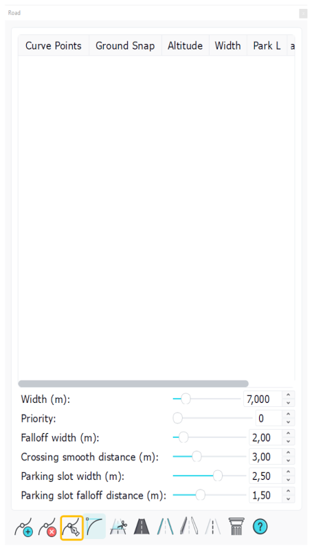 By default the roads are very sharp and don't really have any curves. You can change this by opening the view of the road where you want smooth curves and click on the "Select linear interpolation" button (3rd button from the left at the bottom of the window)