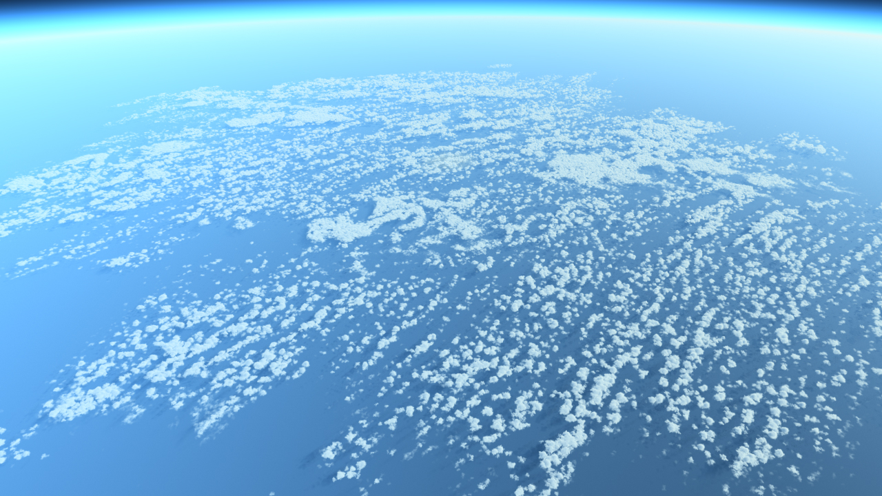 The archive contains a ready-to-use clouds cover filled with 6 cumulus clouds, ready to use in NDunes. It's size is set by default to 300 kms, but it can be used in any range between 100 kms and 500 kms, or even at larger sizes since the source cover map is 4k. See how it looks below: